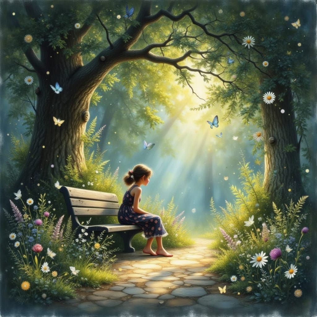 This image depicts a lone figure on a park bench in a magical, overgrown forest. Dappled sunlight illuminates glowing plants and dust motes, rendered in a soft, dreamy illustration style.
