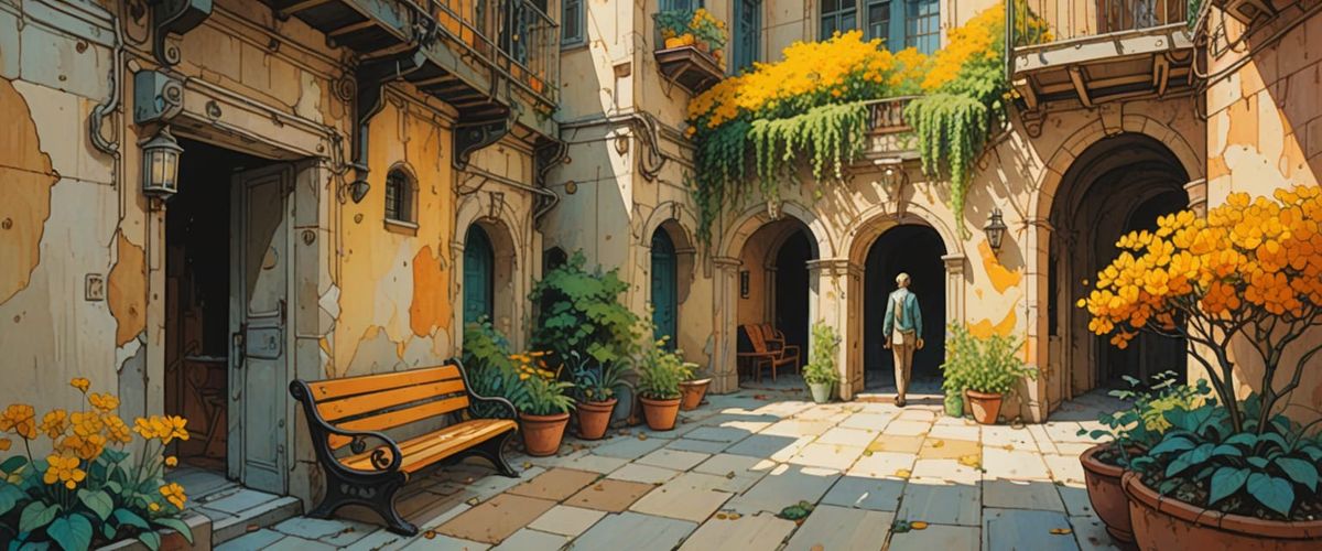A digital artwork of a futuristic commune in an abandoned alley. People sit on benches amid arcology structures, rendered with vibrant colors and clear sunlight, reminiscent of comic book art.