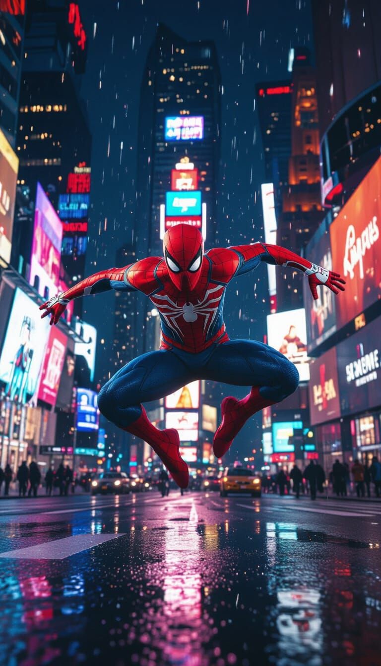 A dynamic image of Spider-Man soaring through Times Square at night. The scene features glowing neon billboards, wet pavement reflections, and motion blur, rendered in a hyper-realistic cinematic style.