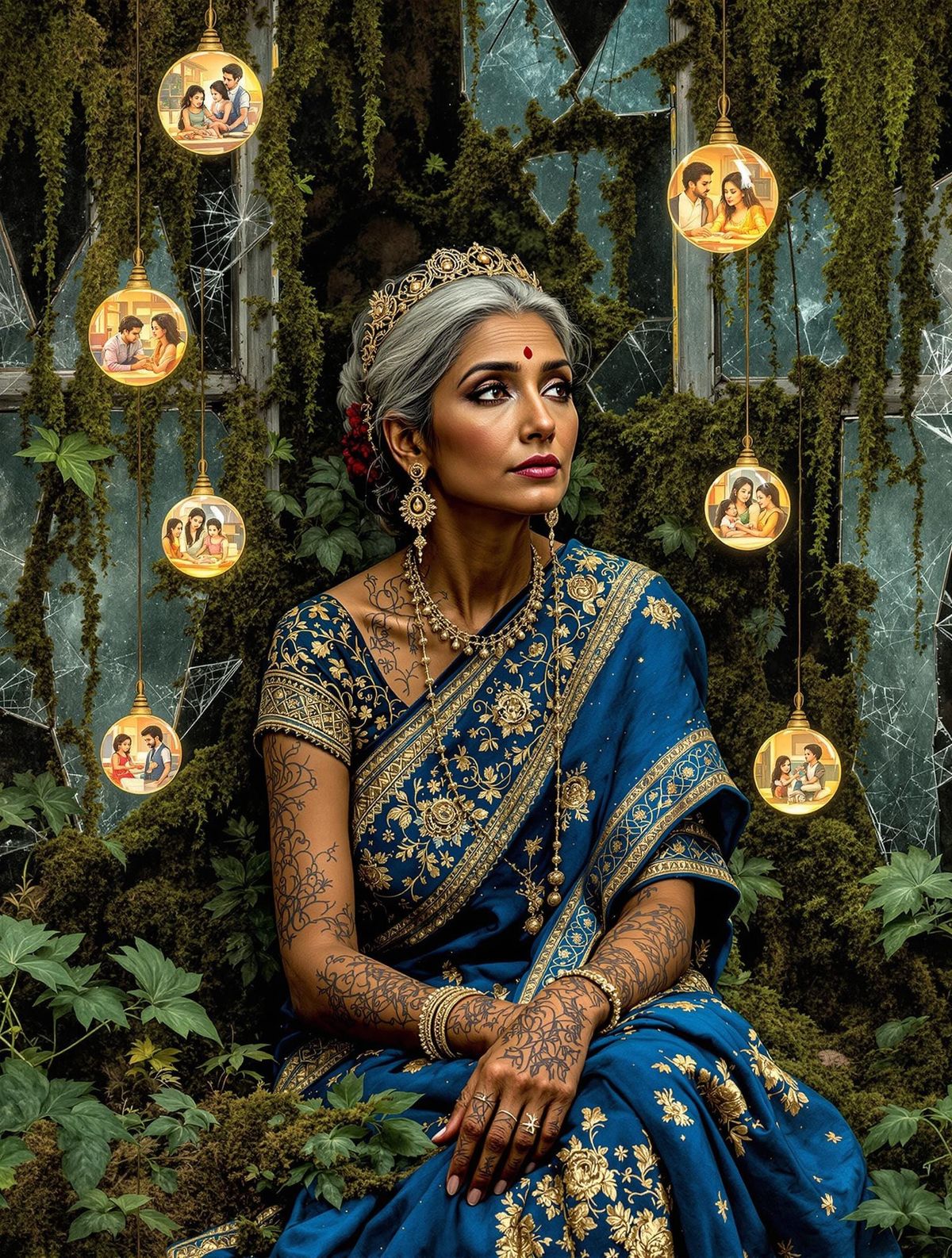 This serene image depicts a South Asian woman in her sixties surrounded by lush foliage and shattered glass in an overgrown urban greenhouse. Soft, weathered skin and a tranquil gaze convey wisdom and longing.