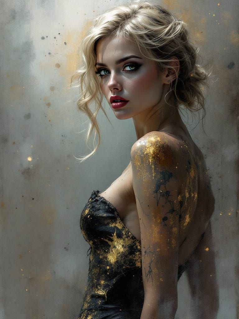 This image features a 1970s blonde pin-up woman with direct eye contact, rendered in a surreal watercolor style with atmospheric ink splatters and muted tones highlighted by metallic accents.