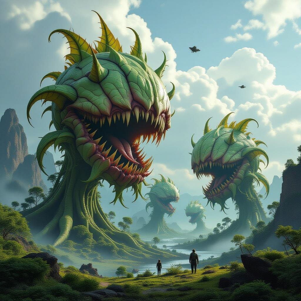This image shows a hauntingly detailed depiction of a desolate, sci-fi world overrun by massive, deadly plants, evoking the dark, dystopian visions of Syd Mead and Ian McQue.