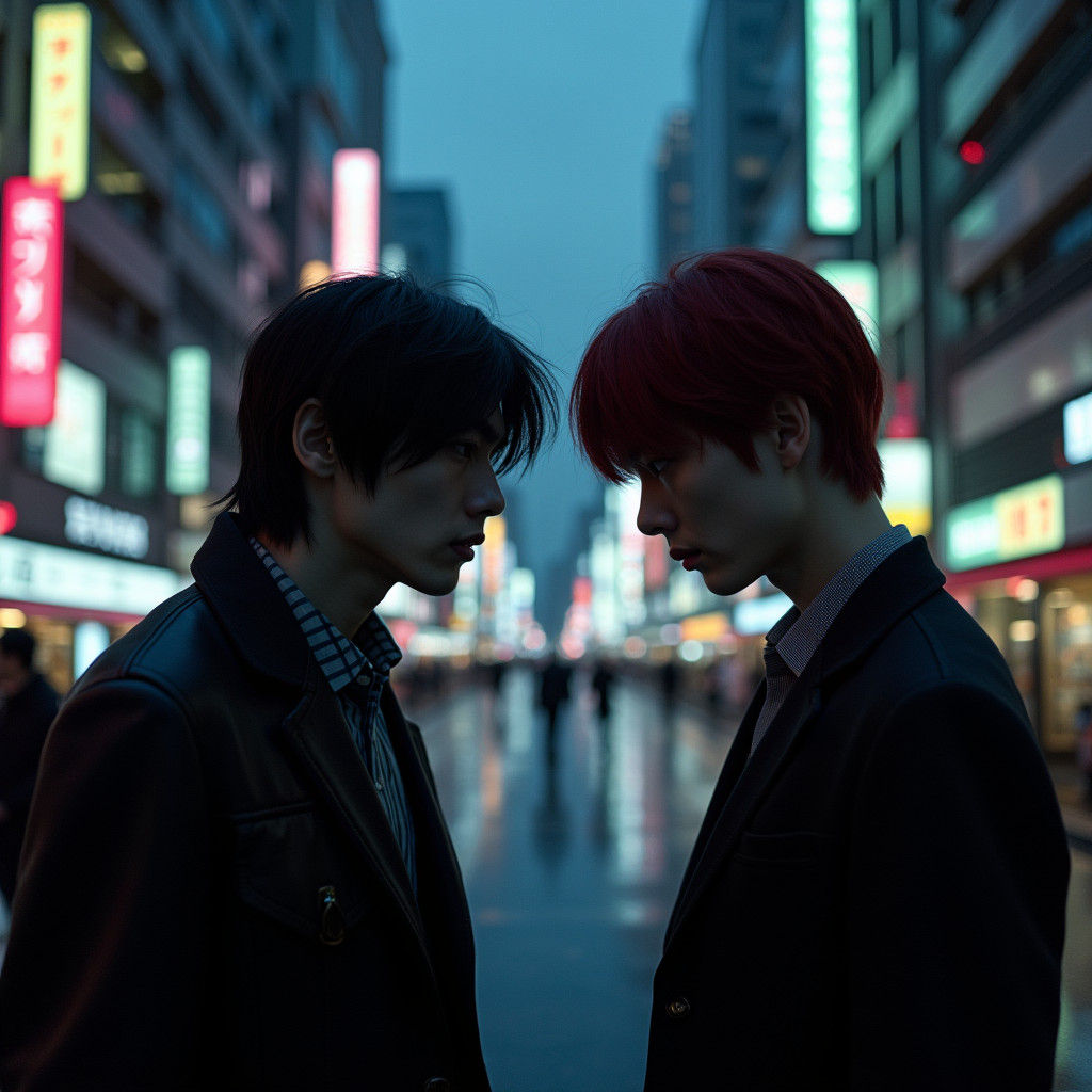 This striking image captures a face-off between two figures against a neon-lit Tokyo backdrop. Strong shadows enhance the scene's cinematic feel, reminiscent of street photography, with a gritty, realistic aesthetic.