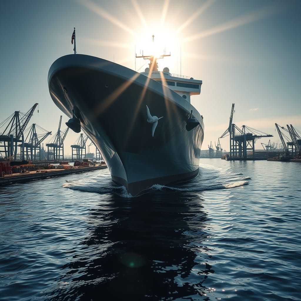 This image shows a large ship sailing through a busy harbor, with sunlight reflecting off its hull. The scene features intricate details and sharp focus, capturing a dramatic, high-contrast atmosphere.