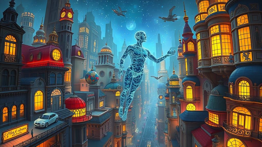 This image shows a bioluminescent human figure floating above a fantastic cityscape filled with exaggerated architecture. The city blends classical and futuristic elements, rendered in a surreal style with a soft, ethereal glow.