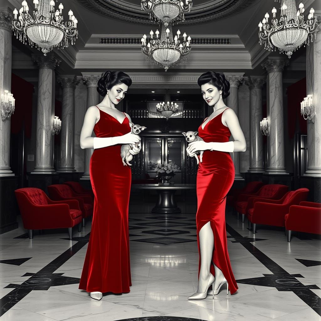 A striking black and white image of two women in old Hollywood glamour, standing in a lavish theater lobby with crystal chandeliers, marble columns, and velvet seating. They wear ruby red evening gowns, white gloves, and stiletto heels, each holding a pampered chihuahua.