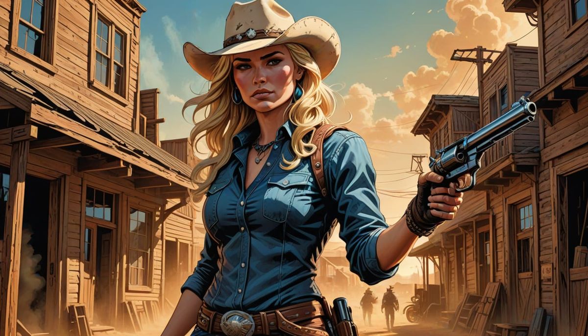 A vibrant comic book art style portrait of a blonde cowgirl holding a gun in a dusty western town. The hyperrealistic image features detailed textures and colorful shading.