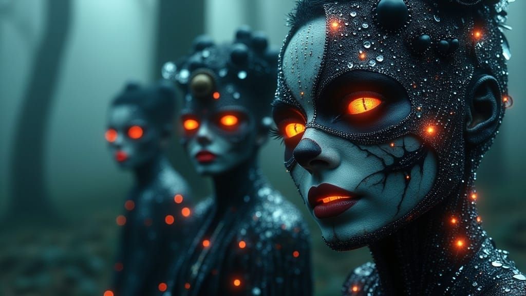 A striking picture of sequined raven figures in tattered finery. The image blends neon noir with eerie landscapes, vibrant colors, and dye-transfer textures, capturing a haunting and mystical atmosphere.