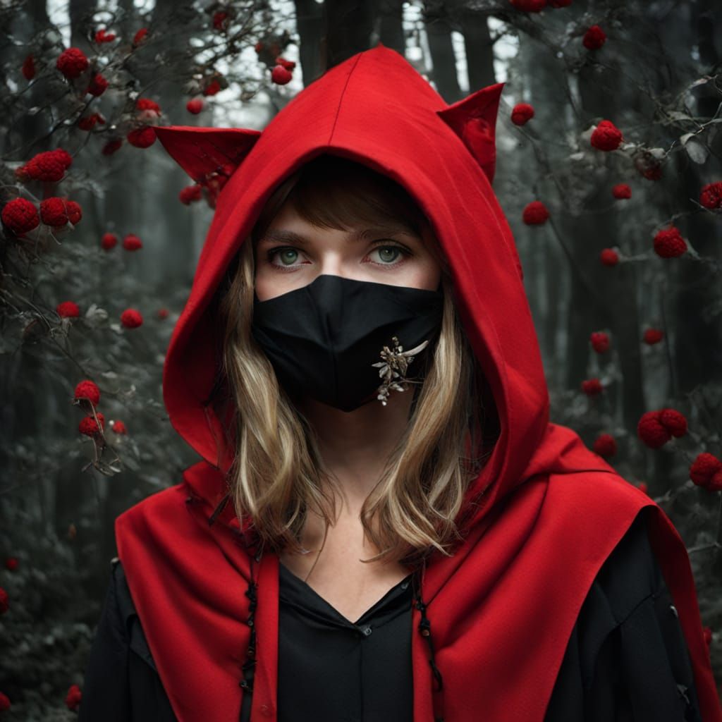 A charming illustration of a young girl walking through a forest, wearing a bright red hooded cape, set in a traditional fairy tale style with watercolor-inspired colors and gentle brushstrokes.