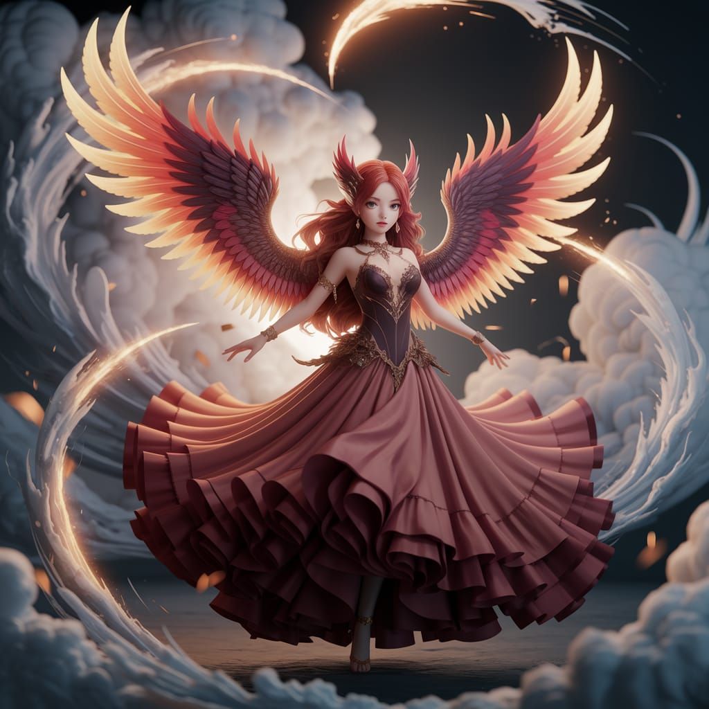 This image shows an anime girl with phoenix wings dancing in a swirling cloudscape. She has crimson hair and wears a ball gown, all rendered with cinematic lighting and ultrafine detail in a Studio Trigger-inspired aesthetic.