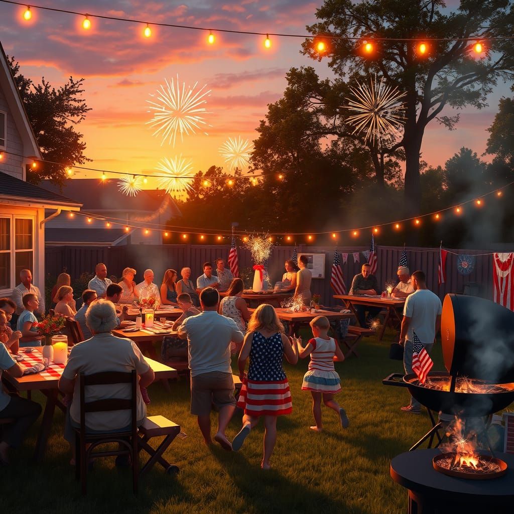 This image shows a vibrant Fourth of July gathering at dusk. Friends and family celebrate with flags, sparklers, and barbecue, under festive lights and exploding fireworks. The image is rendered with hyperrealism.