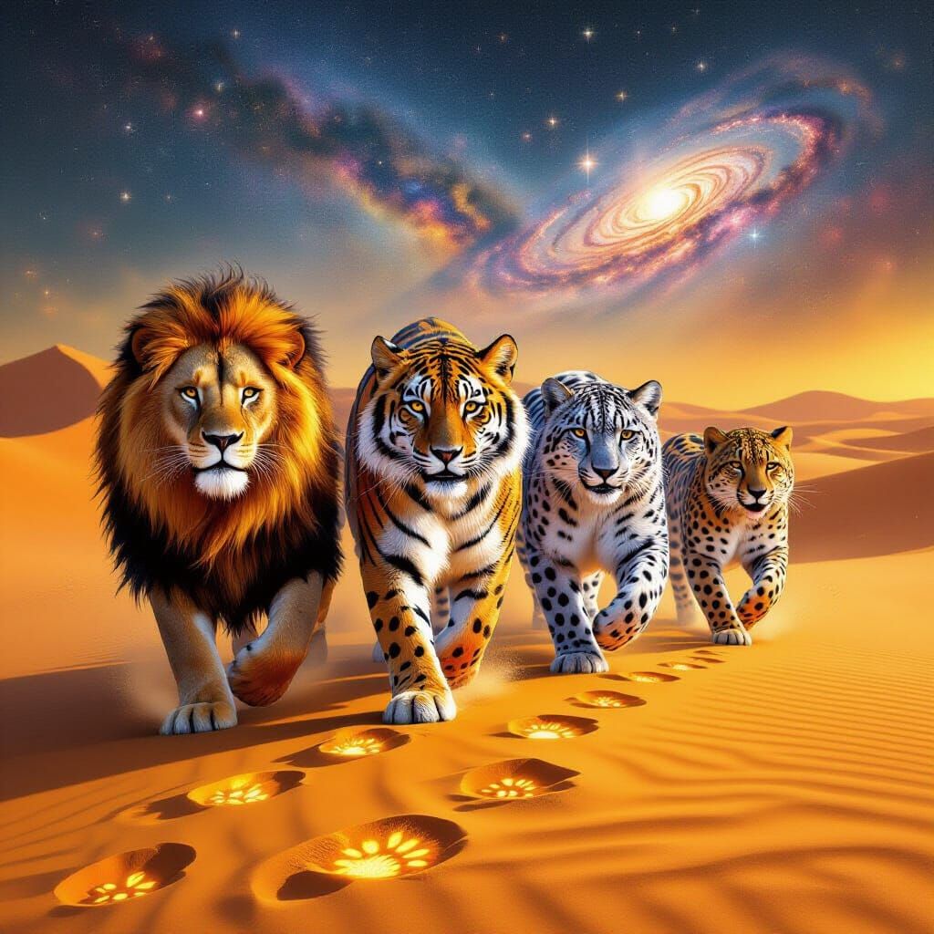 A striking picture of big cats traversing a golden desert. Their glowing paw prints transform into galaxies. Each animal exudes unique beauty, rendered in a hyperrealistic digital art style.