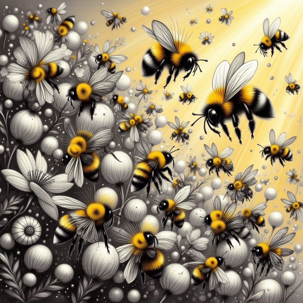 This image shows fuzzy bumblebees in energetic flight around striking black and white flowers. Rendered in a detailed, illustrative style with a golden hour glow.