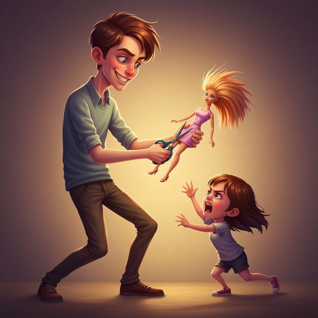 This image shows a comical scene of a lanky boy cutting off a doll's hair while a girl expresses rage, rendered in a vibrant, stylized artistic manner with exaggerated expressions.
