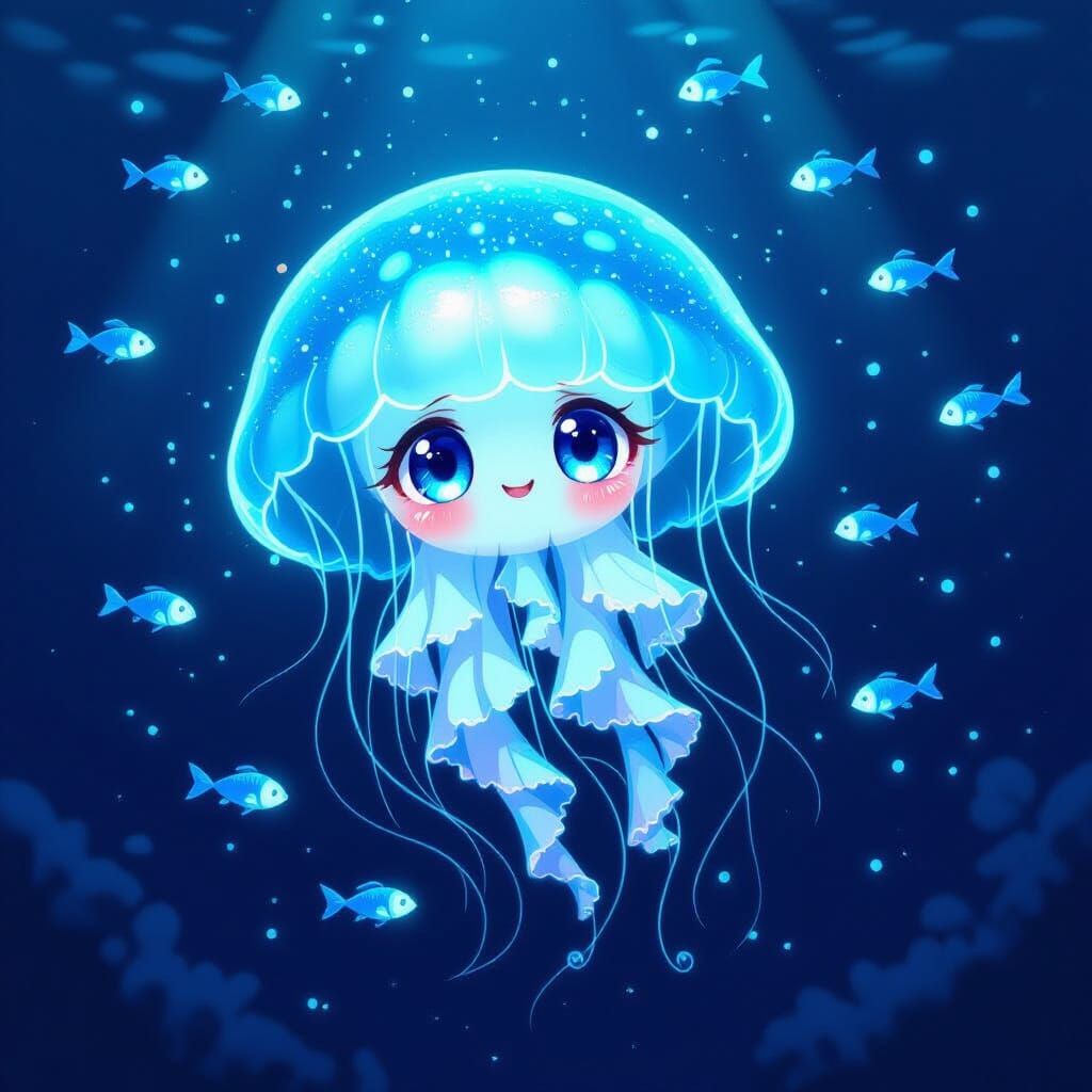 A captivating image of a bioluminescent jellyfish gracefully navigating the deep ocean. The scene is rendered in a vibrant anime style, featuring bold lines and fantastical details.
