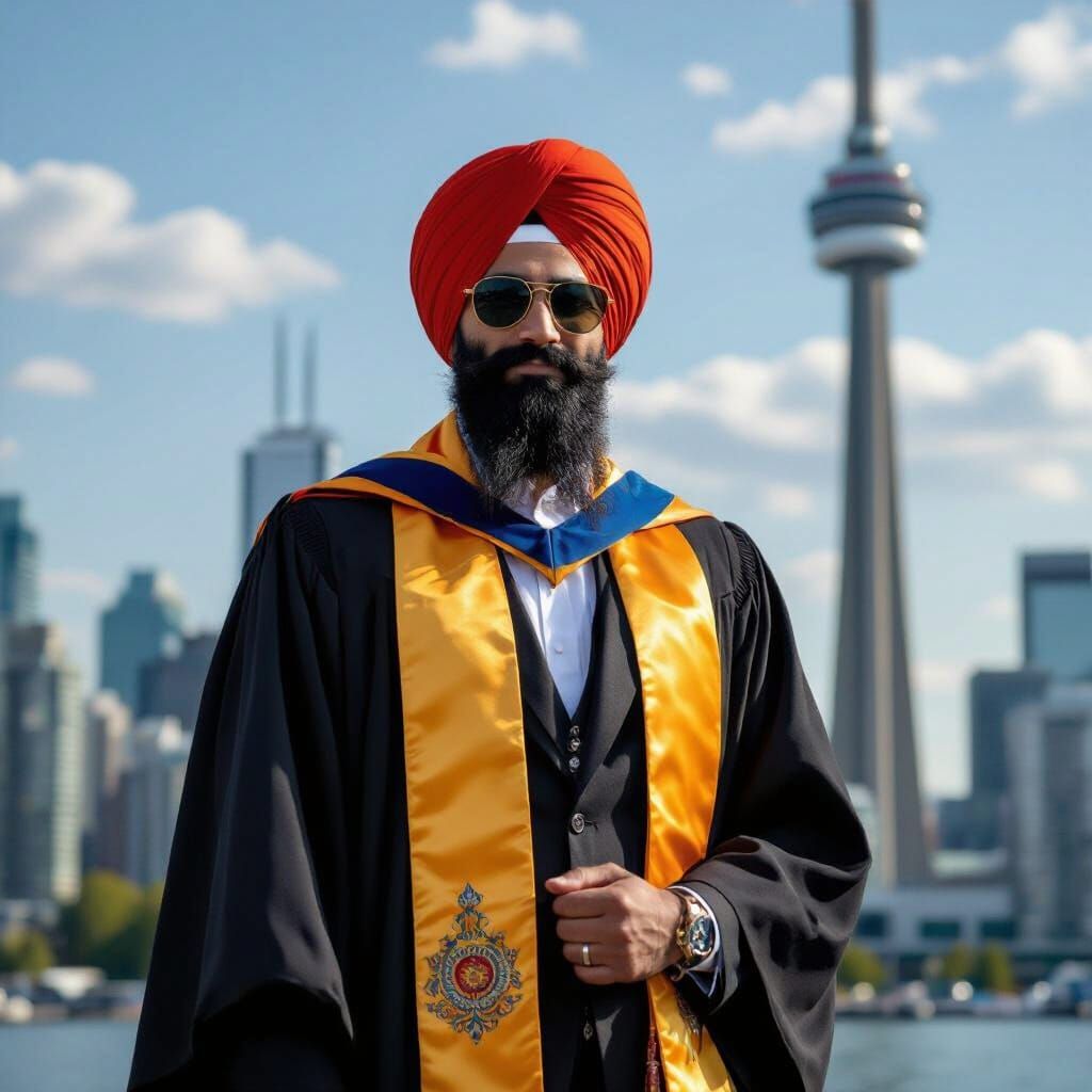 This image shows a Punjabi Sardar in a traditional turban and graduation gown, standing before the CN Tower. The artwork blends realism with cultural elements, inspired by vibrant artistic styles.