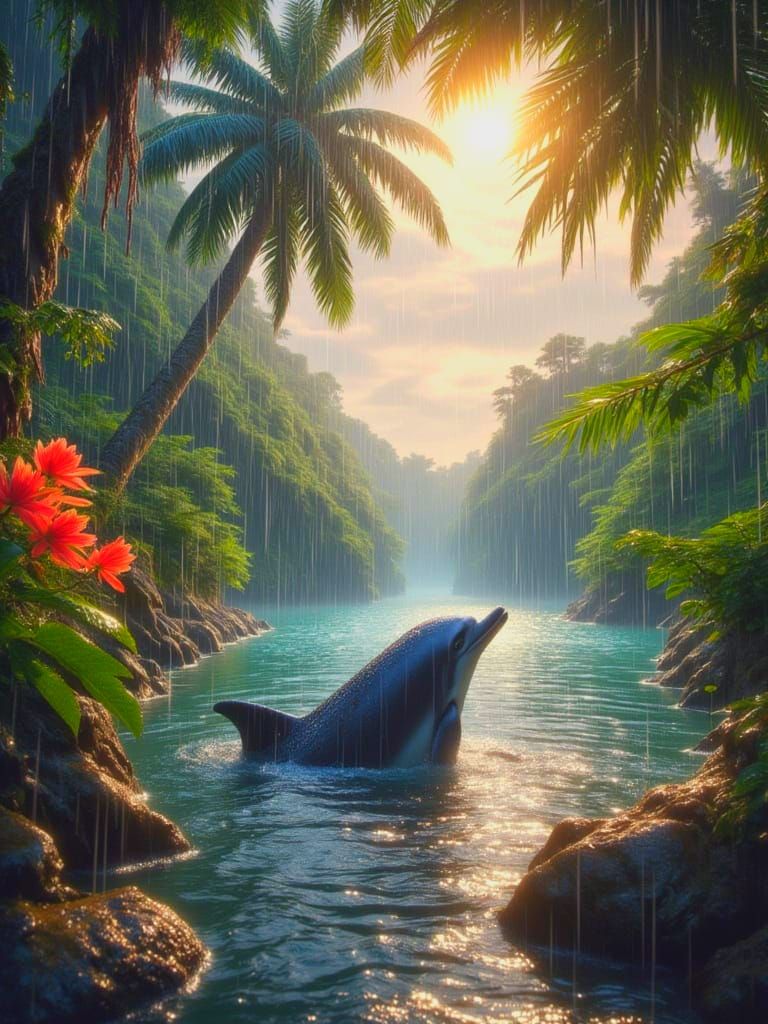 A young bottlenose dolphin is stranded in a shrinking tide pool on a lush island as rain begins to fall. The scene captures the dolphin's plight amidst palm trees and overgrowth.