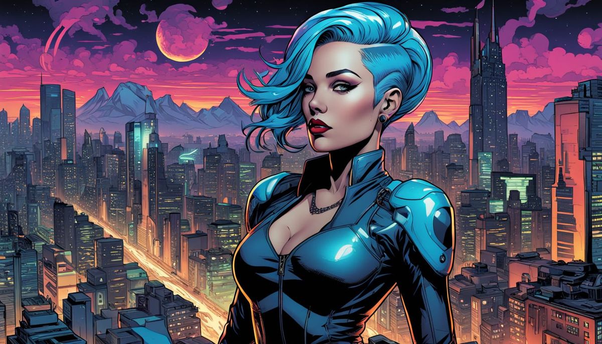 This image shows a striking woman with bright blue hair and glowing tattoos in a futuristic cityscape. The digital painting features vibrant colors and dynamic lighting in a comic book style.