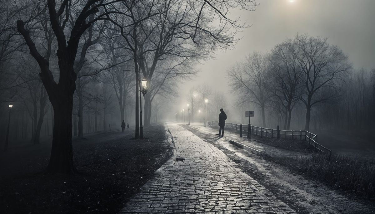 A captivating cityscape photograph featuring a crescent moon shrouded in mist. The image showcases a cinematic atmosphere with soft focus, bokeh, and vignetting, creating a sense of depth and loneliness.