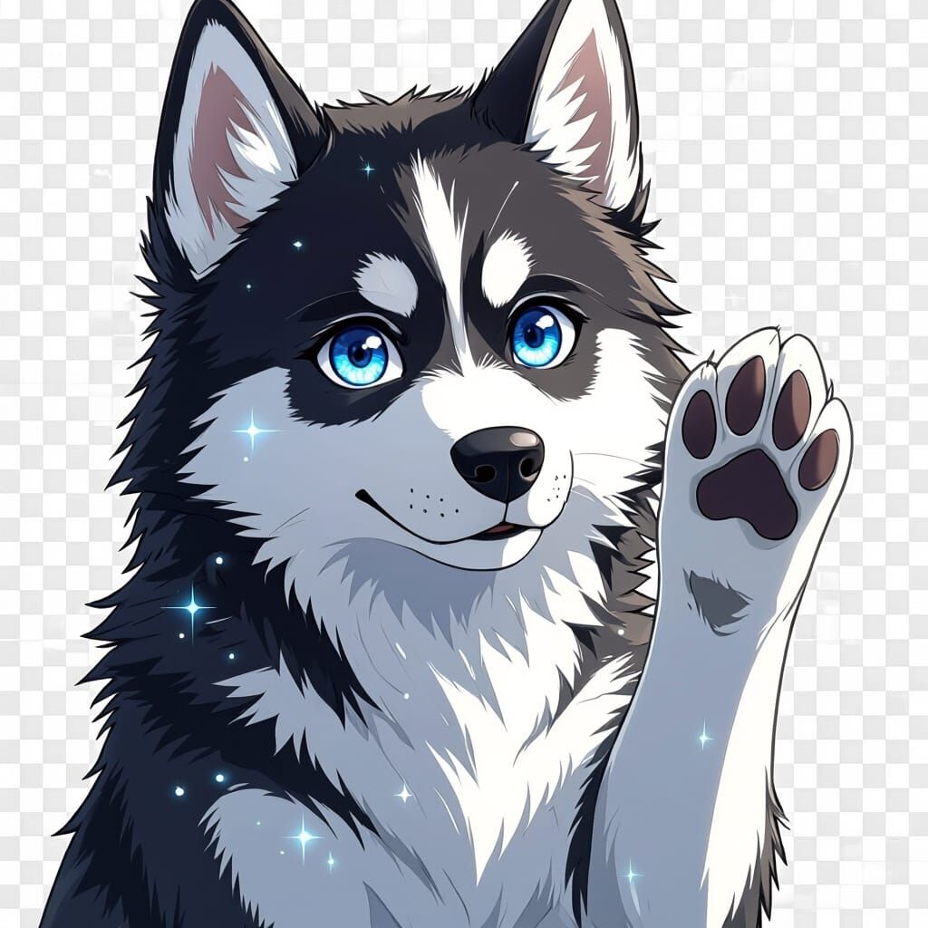 This image shows a husky dog with striking blue eyes and black and white fur. The artwork features soft shading and a manga-inspired aesthetic, resembling a classic Japanese anime illustration.