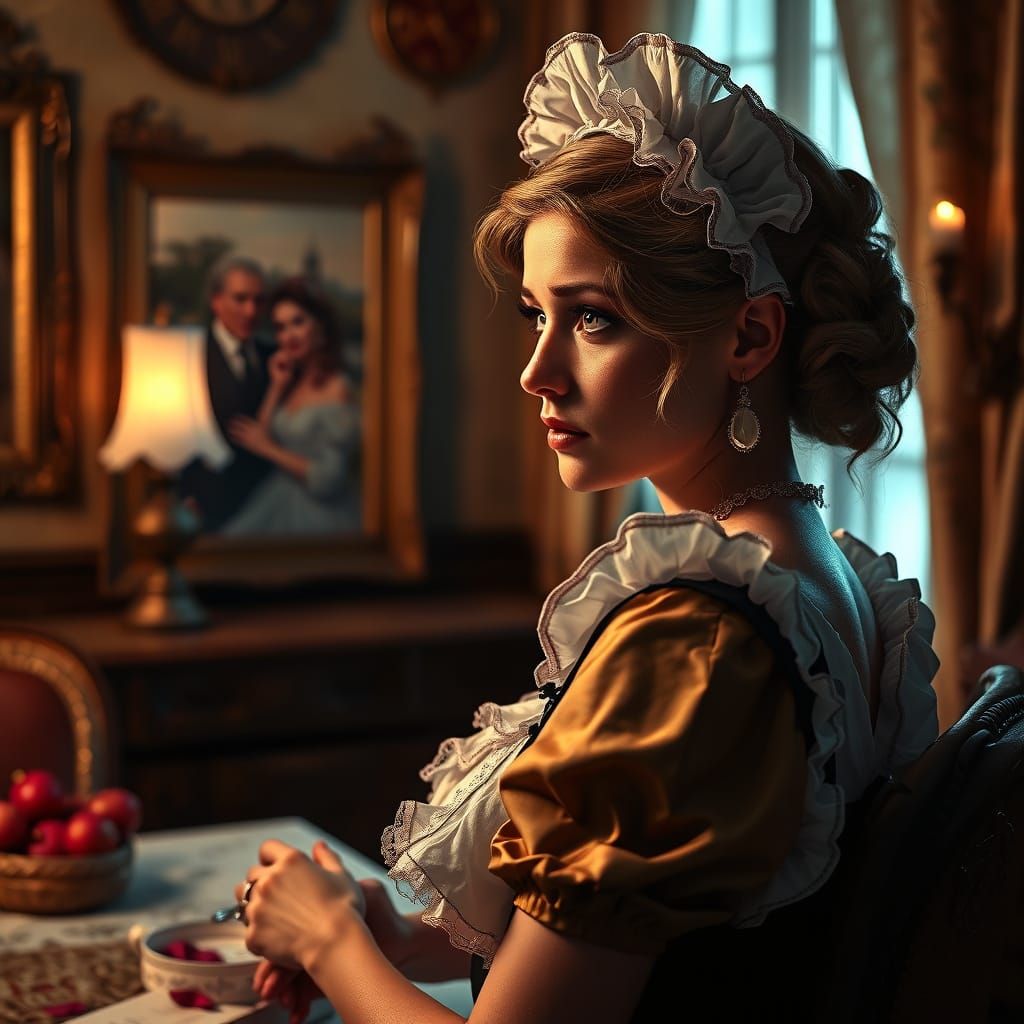 This heartwarming image captures a Sissymaid lost in thought, gazing at a nostalgic photo of her past life as a husband, now her Mistress, in a tender and intimate moment, reminiscent of hyperrealistic comic book art.