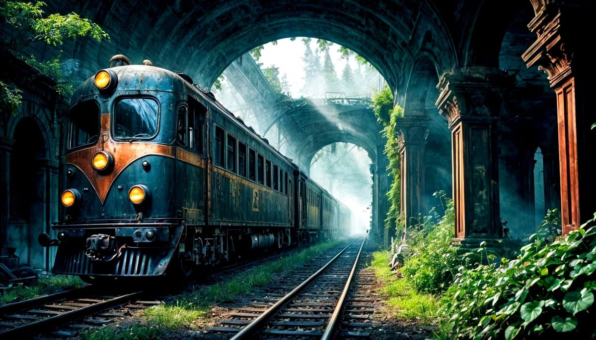 This image is a captivating blend of ancient ruins and nature, with a rusted train overgrown by a lush jungle. The scene is illuminated by moonlit silver and gold leaf accents, creating a haunting yet serene atmosphere.