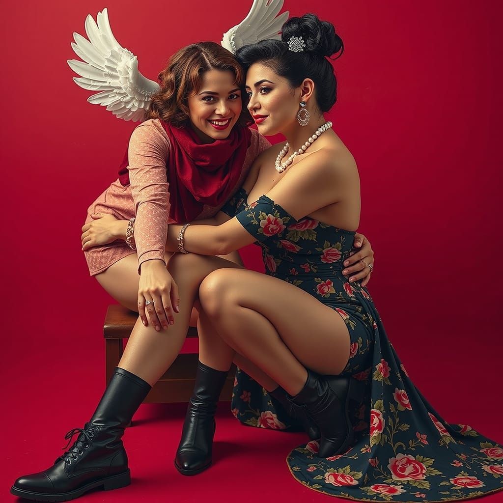 This image depicts women embracing vintage glamour and promoting self-love with a focus on healthy body image through a pin-up style.