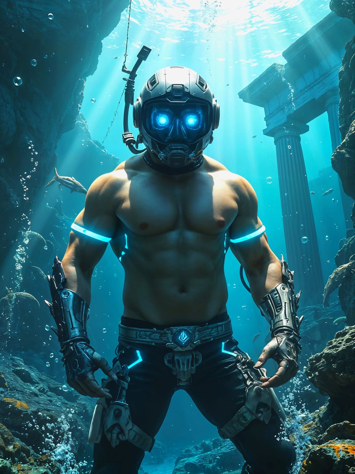 This image shows a muscular cyborg warrior in an underwater action scene. The figure features biomechanical enhancements, high-tech armor, and glowing accents, set against a backdrop of ancient ruins and robotic sea creatures.