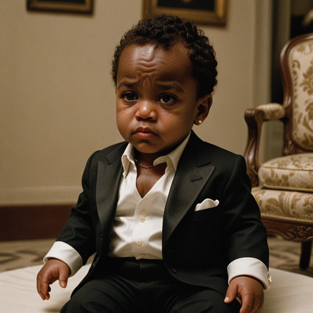 This image shows a stylized caricature of a baby dressed as a gangster. The baby has a determined expression, wearing a suit in a cartoon style.
