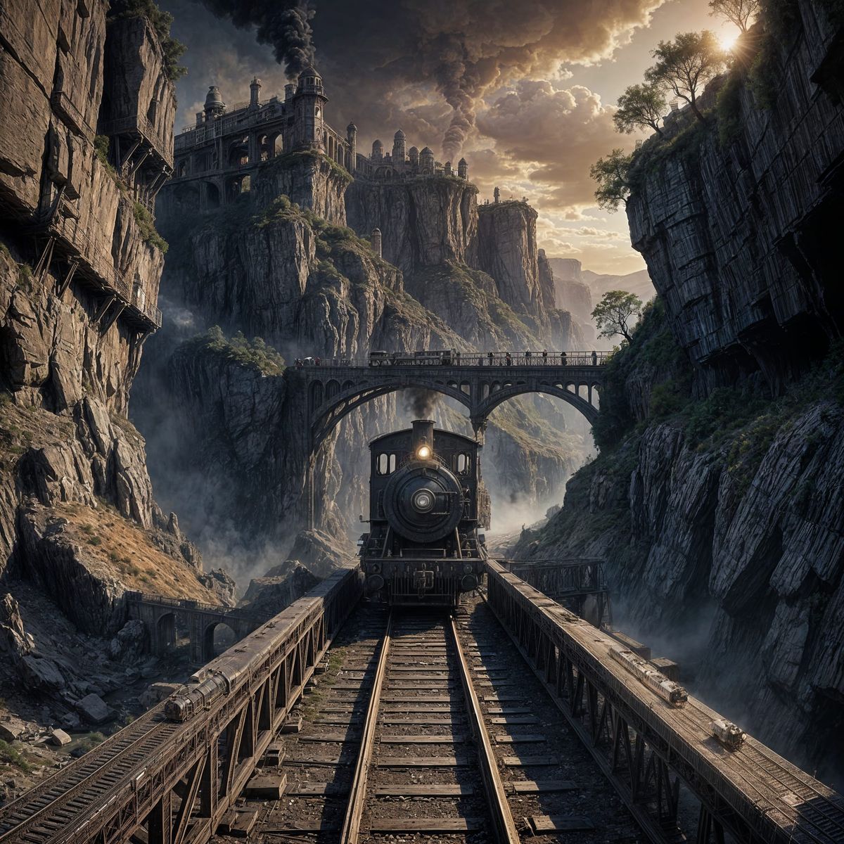 This image shows a dramatic scene of a vintage steam train crossing a rickety bridge over a deep canyon, bathed in the warm golden light of sunset, in a dark and eerie aesthetic reminiscent of 19th-century Romanticism and Gothic art