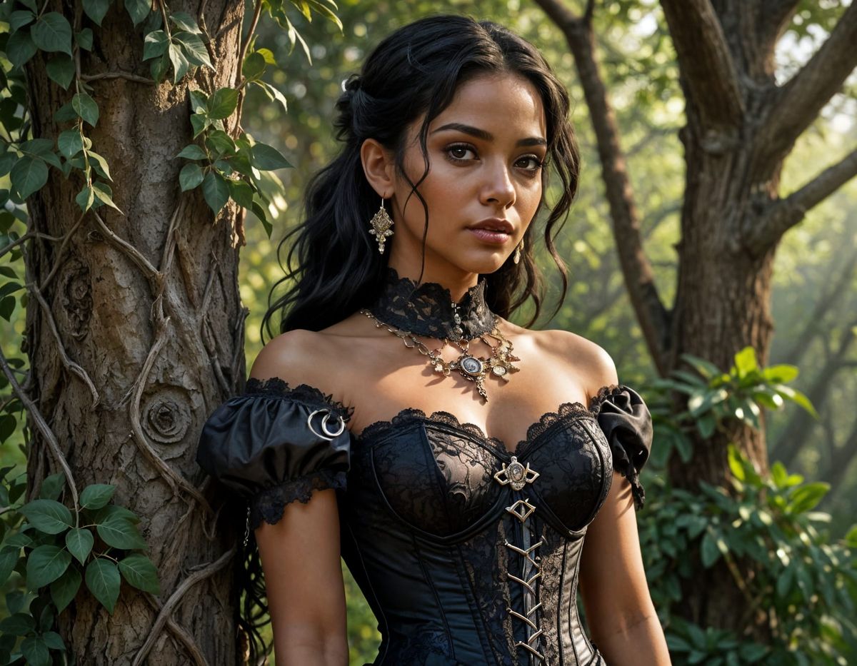 A striking picture of a young Dominican woman in a gothic corset. The hyper-realistic digital art features intricate details, metallic accents, and a warm, golden glow.