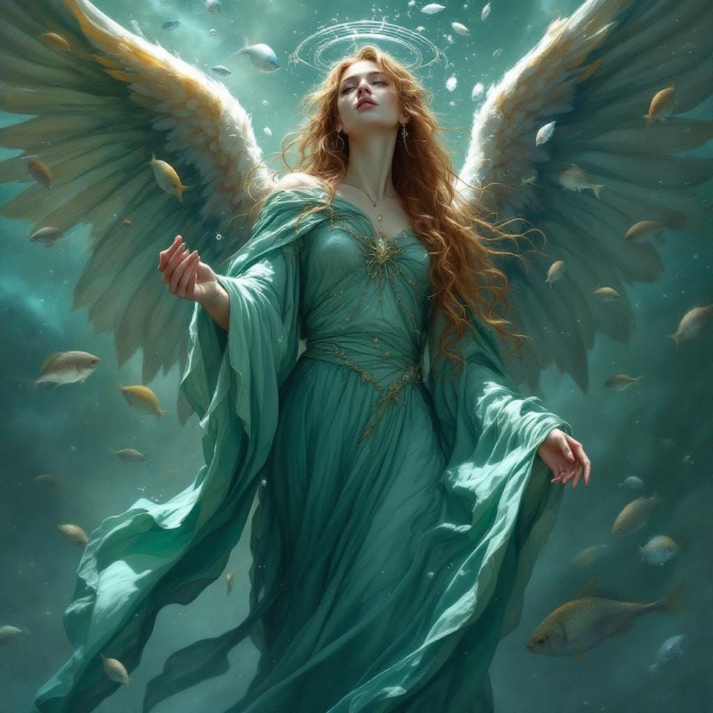 A serene portrait of Arariel, an angelic figure associated with oceans. She's depicted in flowing green robes surrounded by fish, painted with soft, ethereal brushstrokes and intricate details.