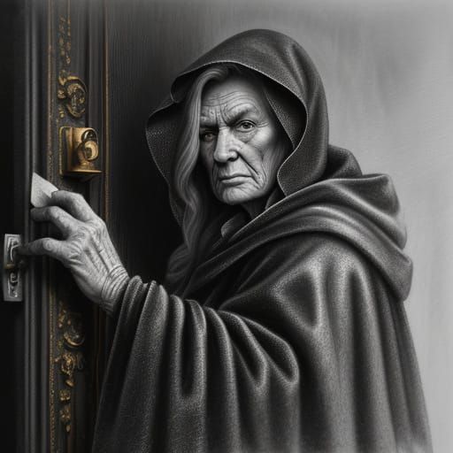 A close-up of a wrinkled woman in a richly textured velvet cloak, standing before a mysterious door, with detailed charcoal drawings and vintage paper textures, set against a misty background