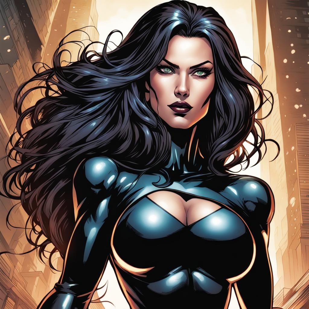 A comic book style image of a female super villain with long hair, wearing a dark action suit. The artwork is smooth and detailed, reminiscent of classic comic art.