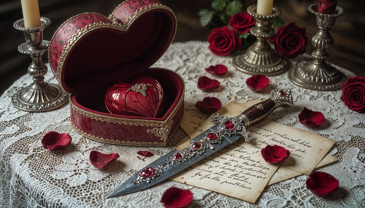 A haunting still life of a blood-stained Valentine box revealing a beating heart, ornate dagger, rose petals, and torn letters. Captured in a gothic realism style with dramatic chiaroscuro lighting.