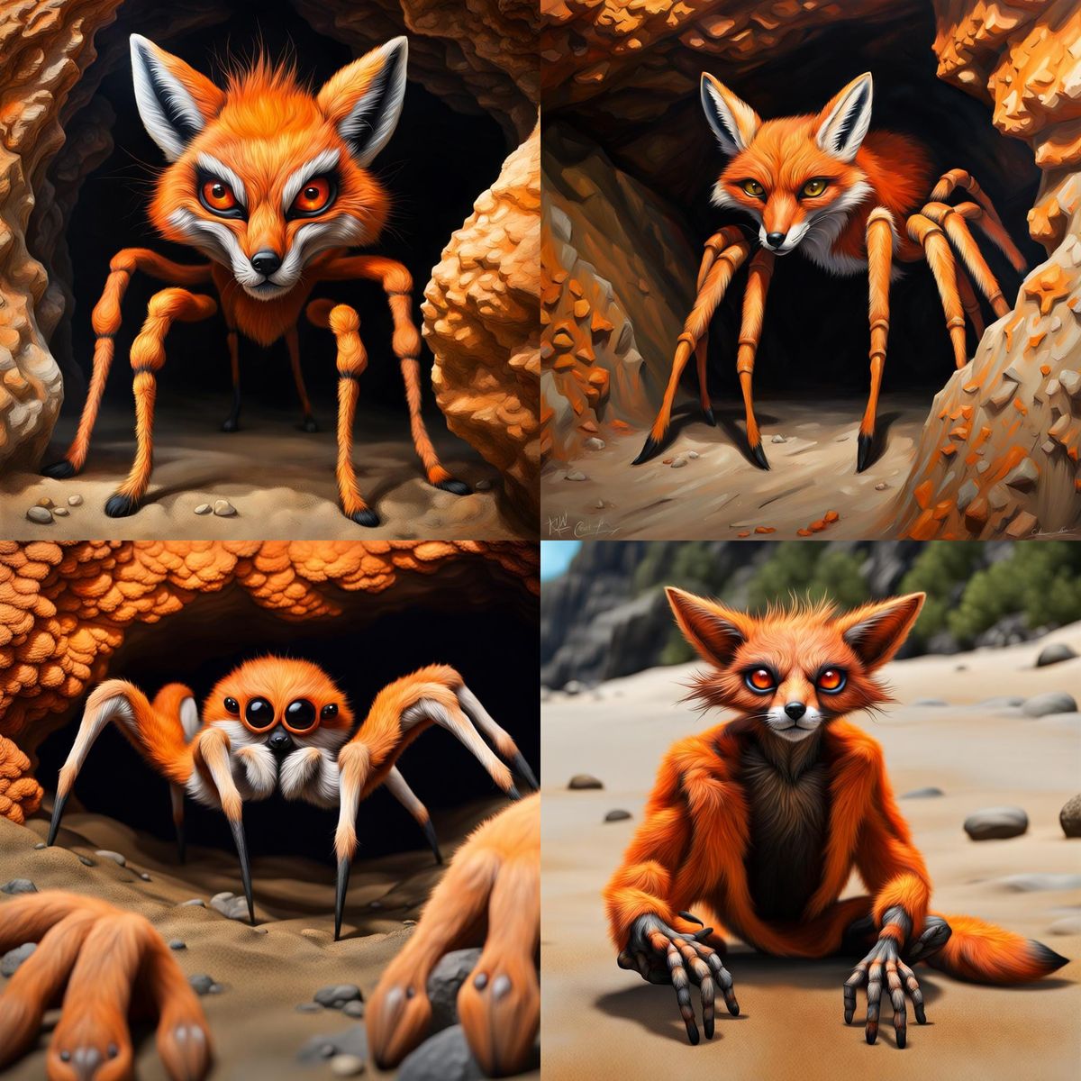 A realistic, full-body image of a spider-faced fox man with orange fur in a beach cave. This digital artwork is reminiscent of detailed oil paintings.