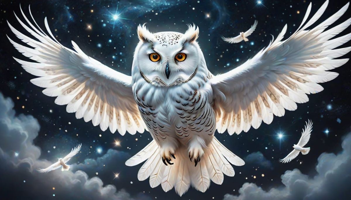 This ethereal illustration shows a majestic white owl flying through a celestial night sky. Its luminous feathers shimmer with inner light, leaving glitter dust trails. Enchanting moonlight illuminates the scene.
