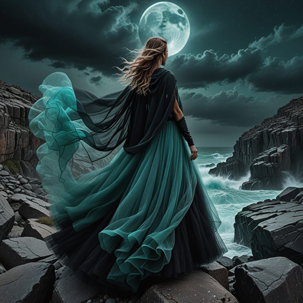 A hyperrealistic image of a woman made of turquoise and black tulle. She stands on rocks above a dark abyss, wearing billowing veils under a turquoise full moon. The image has a photographic effect.