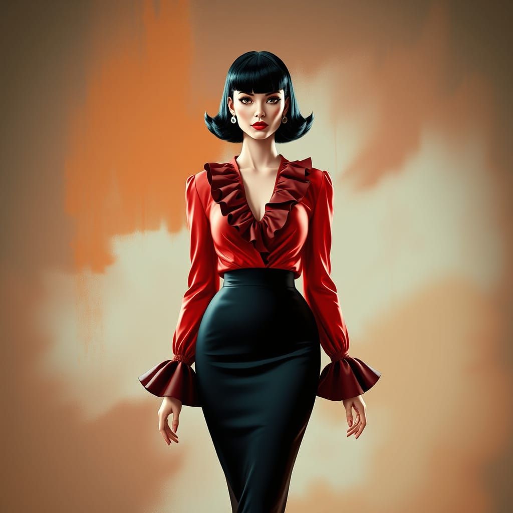 This image shows a slender, vintage fashion model with strong features in a 1950s aesthetic. She is wearing a red blouse, black skirt, and high heels, rendered with dynamic lighting.