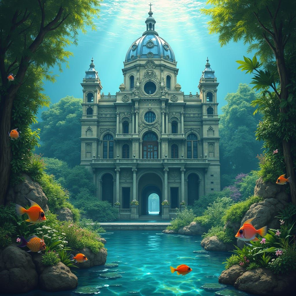 This image depicts Paris City Hall surrounded by vibrant tropical fish and lush greenery, as if submerged in a majestic aquarium, blending reality and fantasy with a mix of realism and stylized textures, evoking a sense of wonder and magic