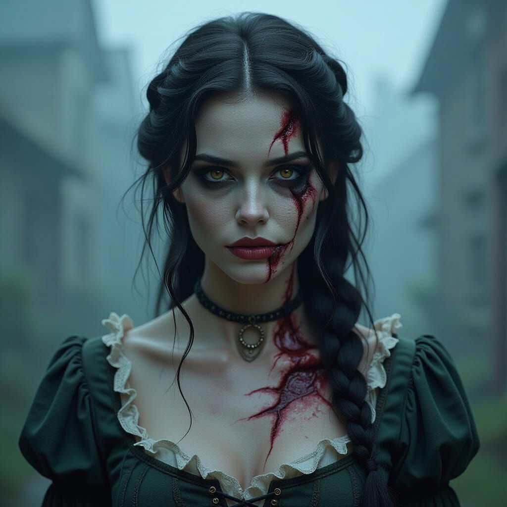 A striking picture of a female Frankenstein's monster in ragged clothing, scars visible on her face. The image features intricate details and textures, set against a dark, misty background, with a haunting, elegant aesthetic.