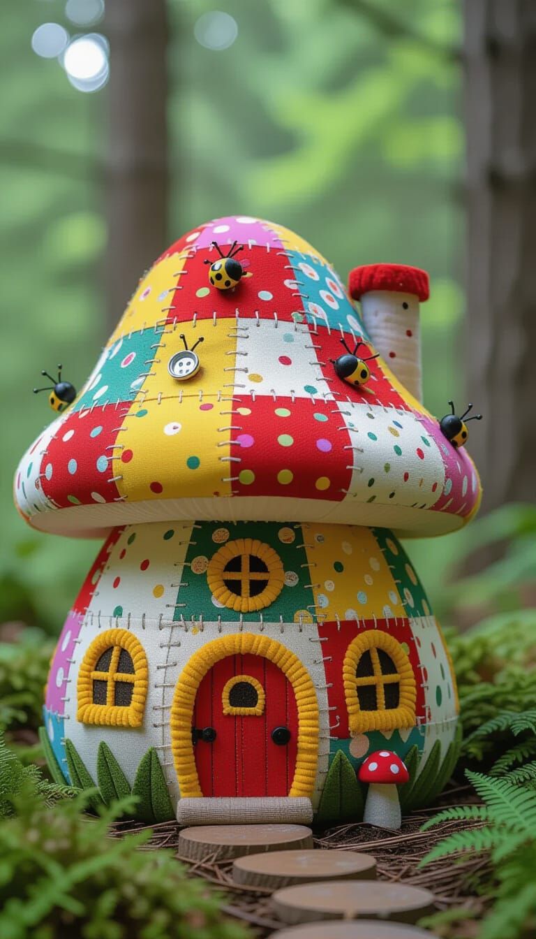 This image shows a whimsical mushroom house made of colorful fabric with detailed stitching. Shimmering buttons add a magical touch to this folk-art inspired scene.