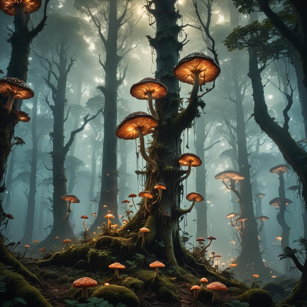 A tranquil forest scene with glowing mushrooms and ancient trees. The digital artwork features soft, cinematic lighting and rich, deep colors, rendered with hyper-realistic textures and intricate details.