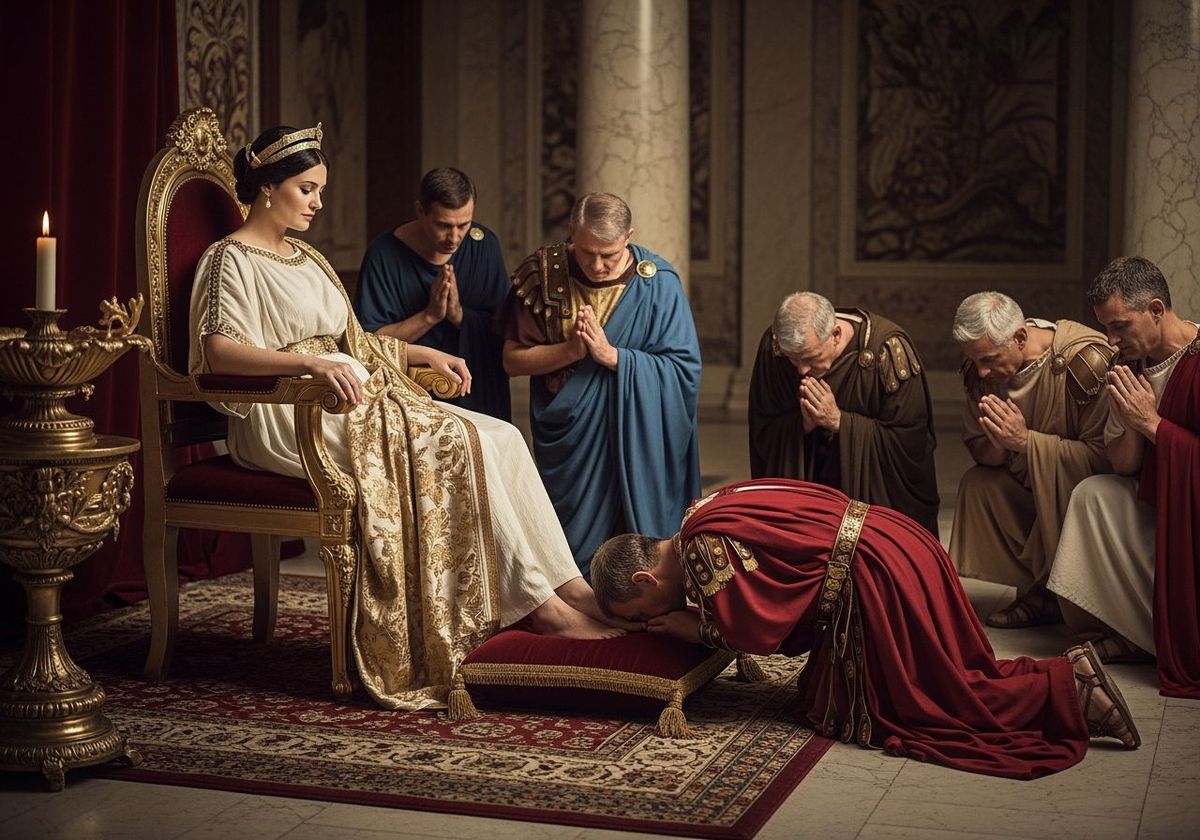 This image shows a Roman Empress in elaborate attire, seated barefoot on a golden throne. Senators kneel before her in homage in this photograph, captured with natural lighting and a shallow depth of field.