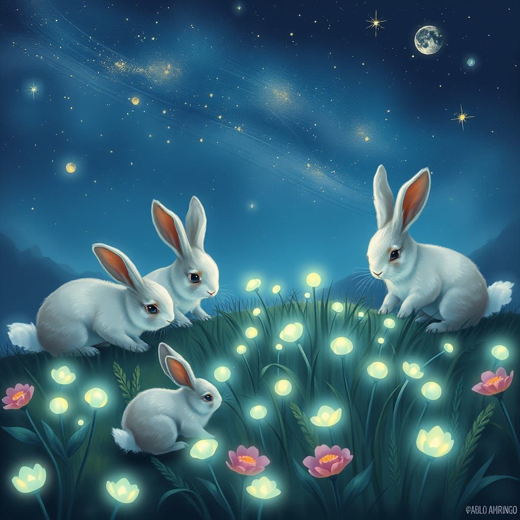 in Bioluminescent Garden 🐇🌟 Rabbits in a glowing garden at night, in a gentle, painterly fantasy illustration style.