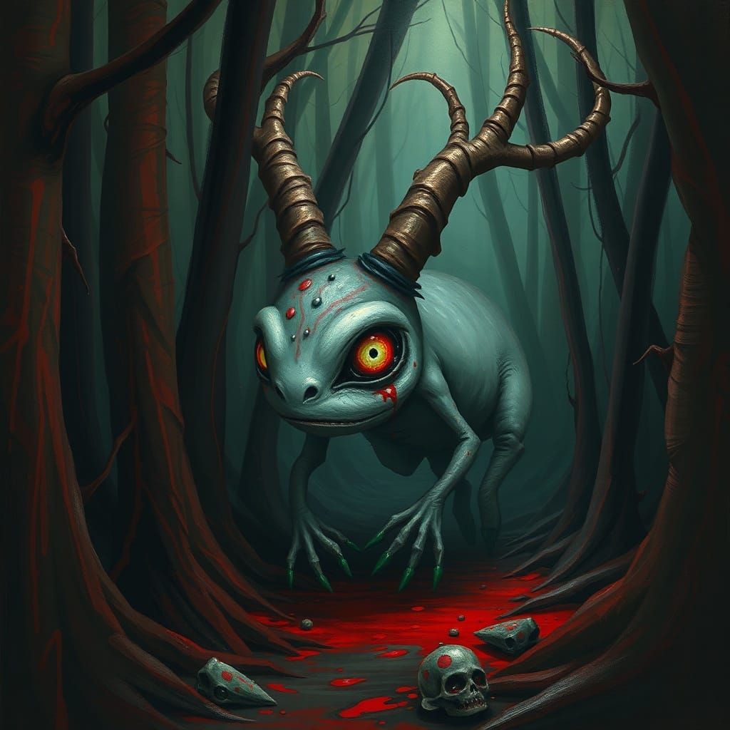 This image depicts a rare, mystical creature in a horror forest, rendered with surrealism and striking clarity. Deep reds and dark greens with bioluminescent accents dominate the scene, evoking a dreamlike, macabre aesthetic.