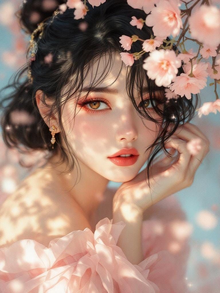 This image showcases a fusion of anime styles in a retro garden. It features a geometric figure study with cherry blossoms and vibrant lighting, rendered with delicate color gradients.