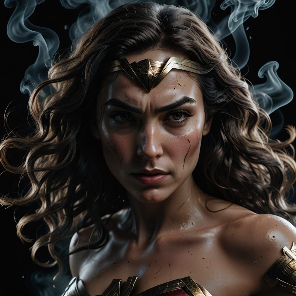 This image shows a powerful and ethereal depiction of Wonder Woman emerging from delicate tendrils of smoke, with iridescent strands shimmering in the light against a deep black background with subtle gradient.
