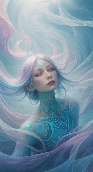 A striking picture of an ethereal being floating among colorful clouds. The image has a dreamlike quality with soft focus and astral-inspired visuals in a vibrant surrealist style.