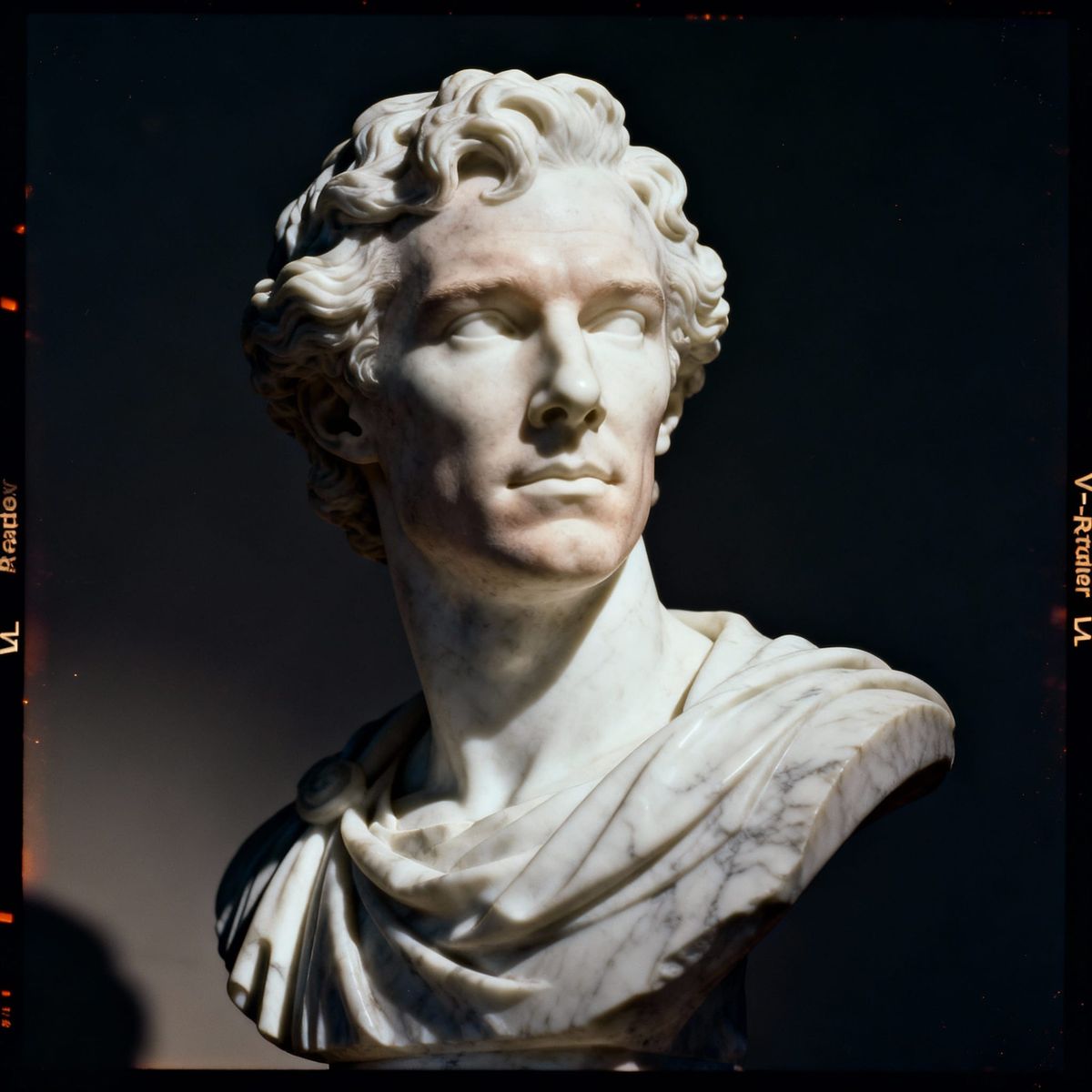 This image presents a white marble bust of Benedict Cumberbatch as a cinematic film still. It features textured film grain, a vignette, and dramatic lighting, evoking a classic 35mm film aesthetic.